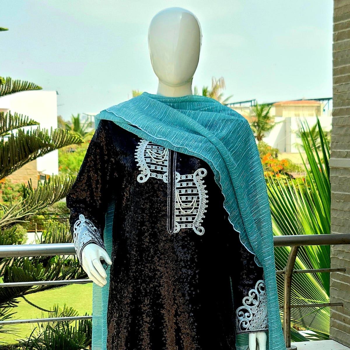 Introducing the first article of our Luxury Pret'23 Collection SHINE BRIGHT. This epitome of elegance is an ink-black whole sequin shirt lined up with geometric tilla work motifs on neckline and sleeves, along with pearls crafting. It's a classic outfit for the upcoming festive season comprised of turquoise blue dupatta with silver tilla tassels, giving a suave look to the dress paired with matching trouser.
