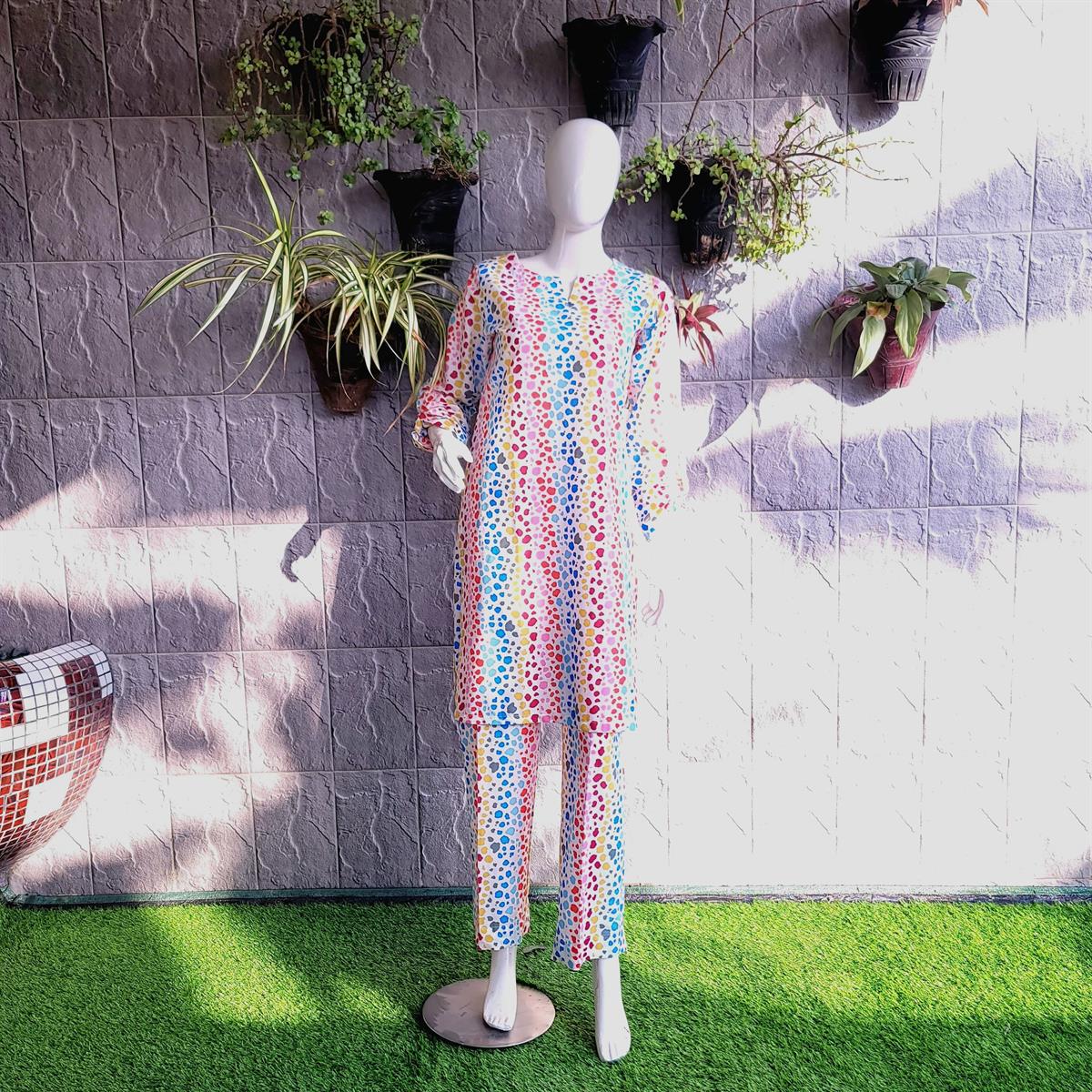 Vibrant rainbow spot lawn print soft summer fabric paired with the same printed trouser.